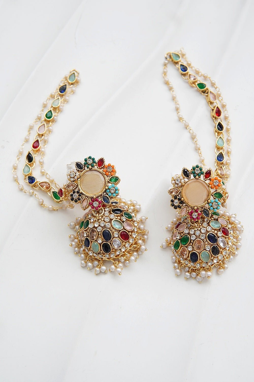 Elevate your festive look with the regal touch of these Royal Dangling Jhumkay. Expertly crafted with intricate stonework and sahara chains, they add timeless elegance to any outfit. Perfect for weddings, parties, or traditional events, these jhumkay will make you stand out gracefully.