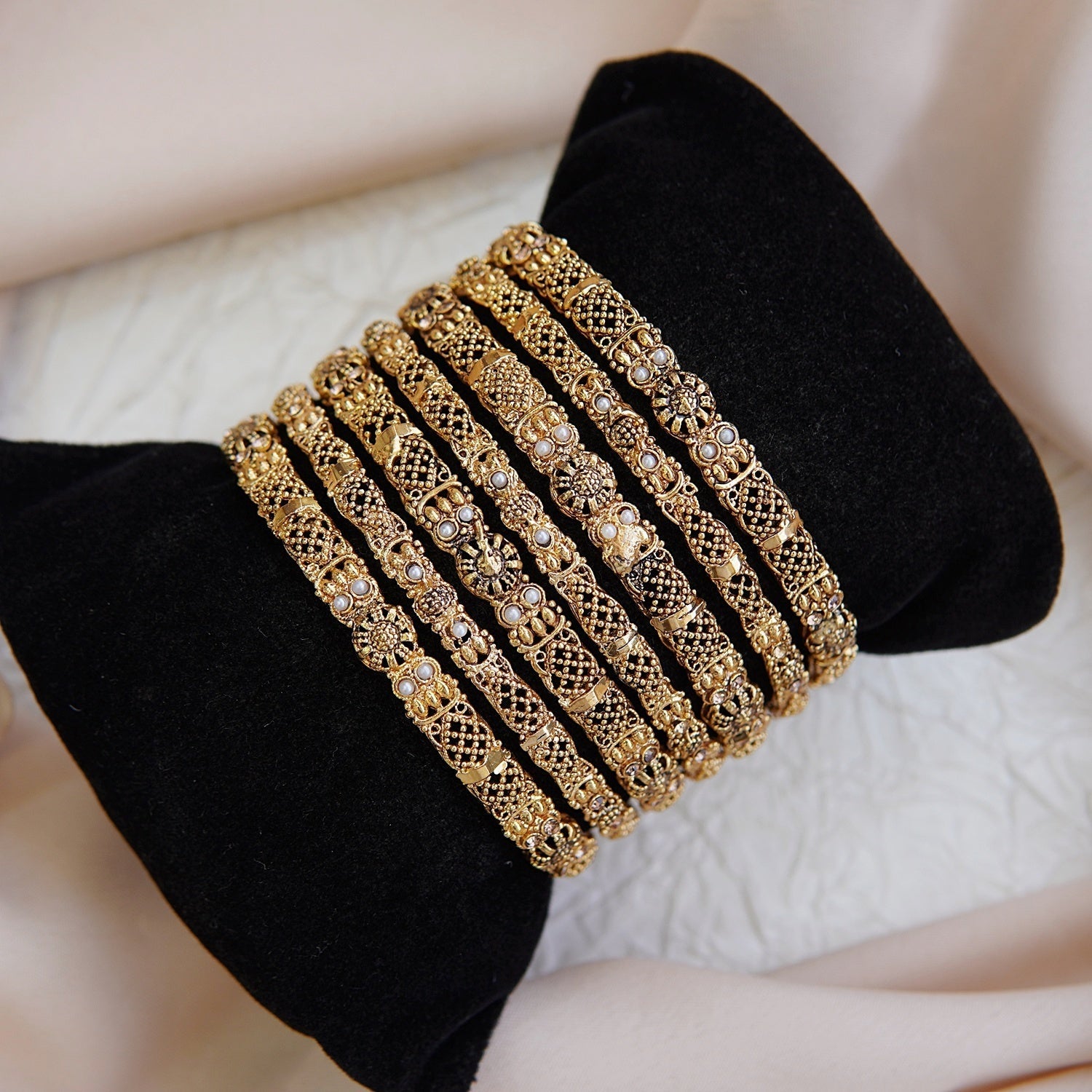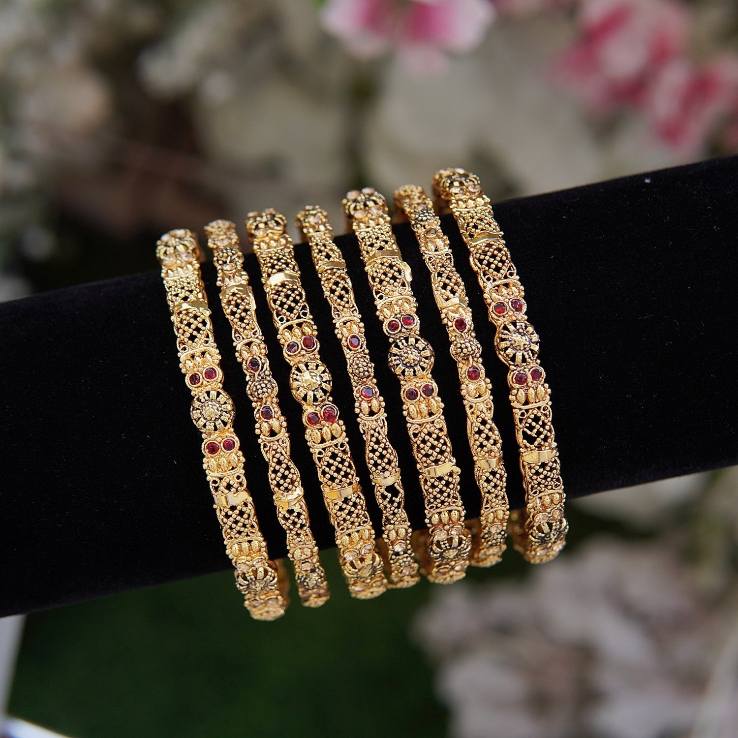 This 7-piece Manjus Chori Karay set features a stunning golden shine plating and precious zircons attached, crafted with a pure copper-based casting material. Elevate your look with this expertly designed and durable set.