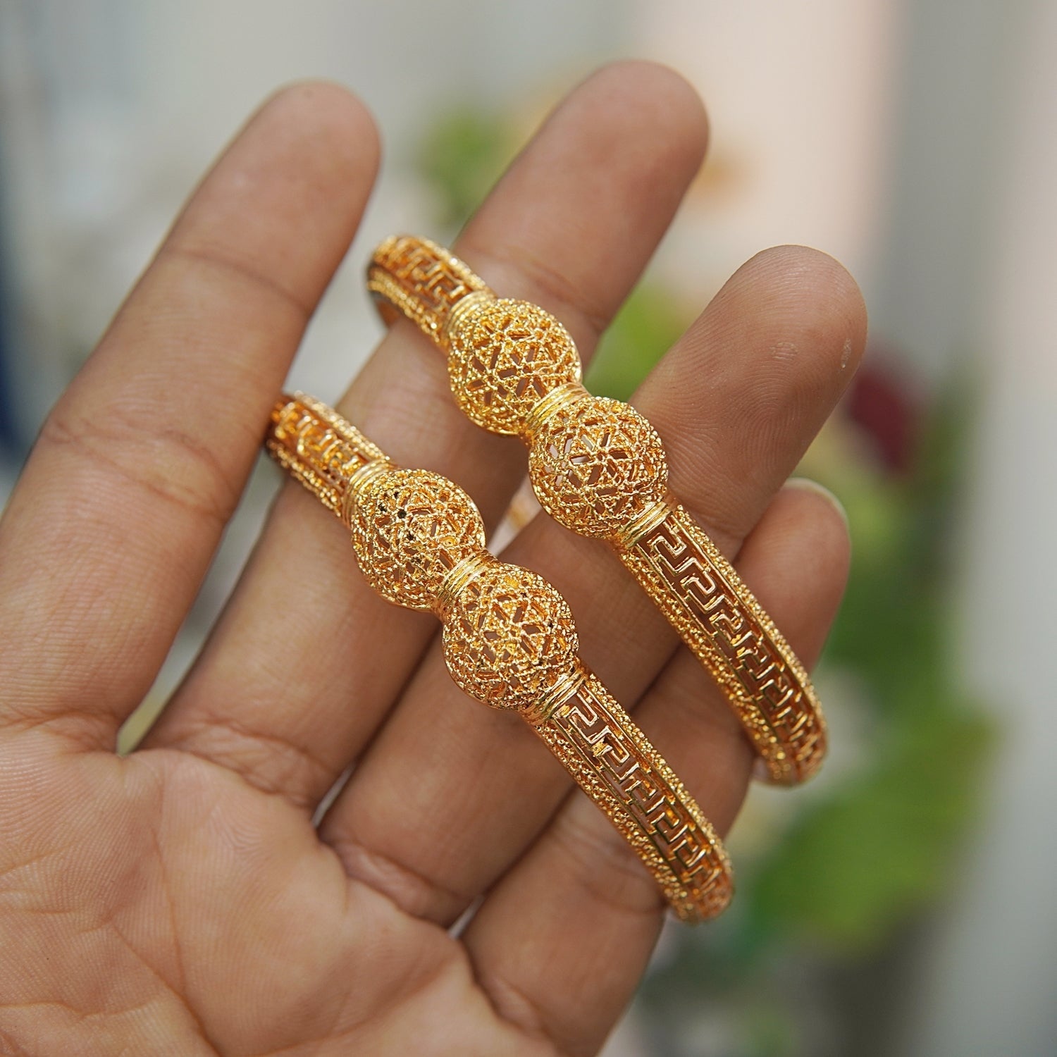 These Gold Plated Plain Bangles come as a pair, featuring a beautiful, stylish design and a lustrous golden plating. Add a touch of elegance and sophistication to any outfit with this versatile and timeless accessory. Comes as pair for effortless coordination.
